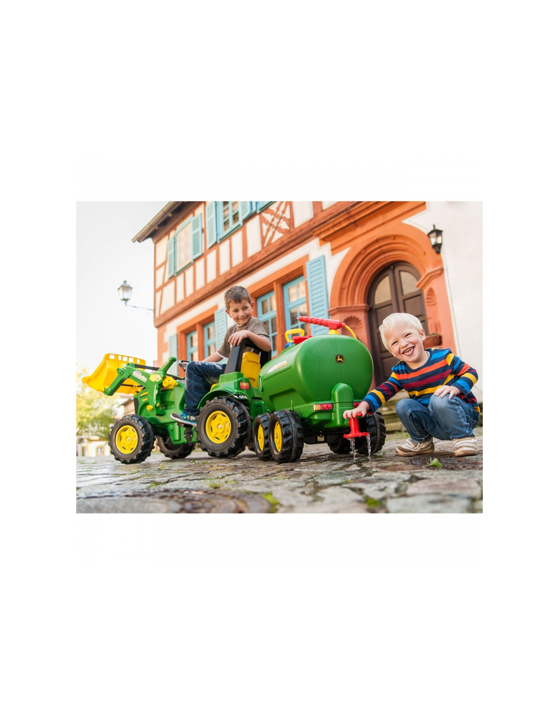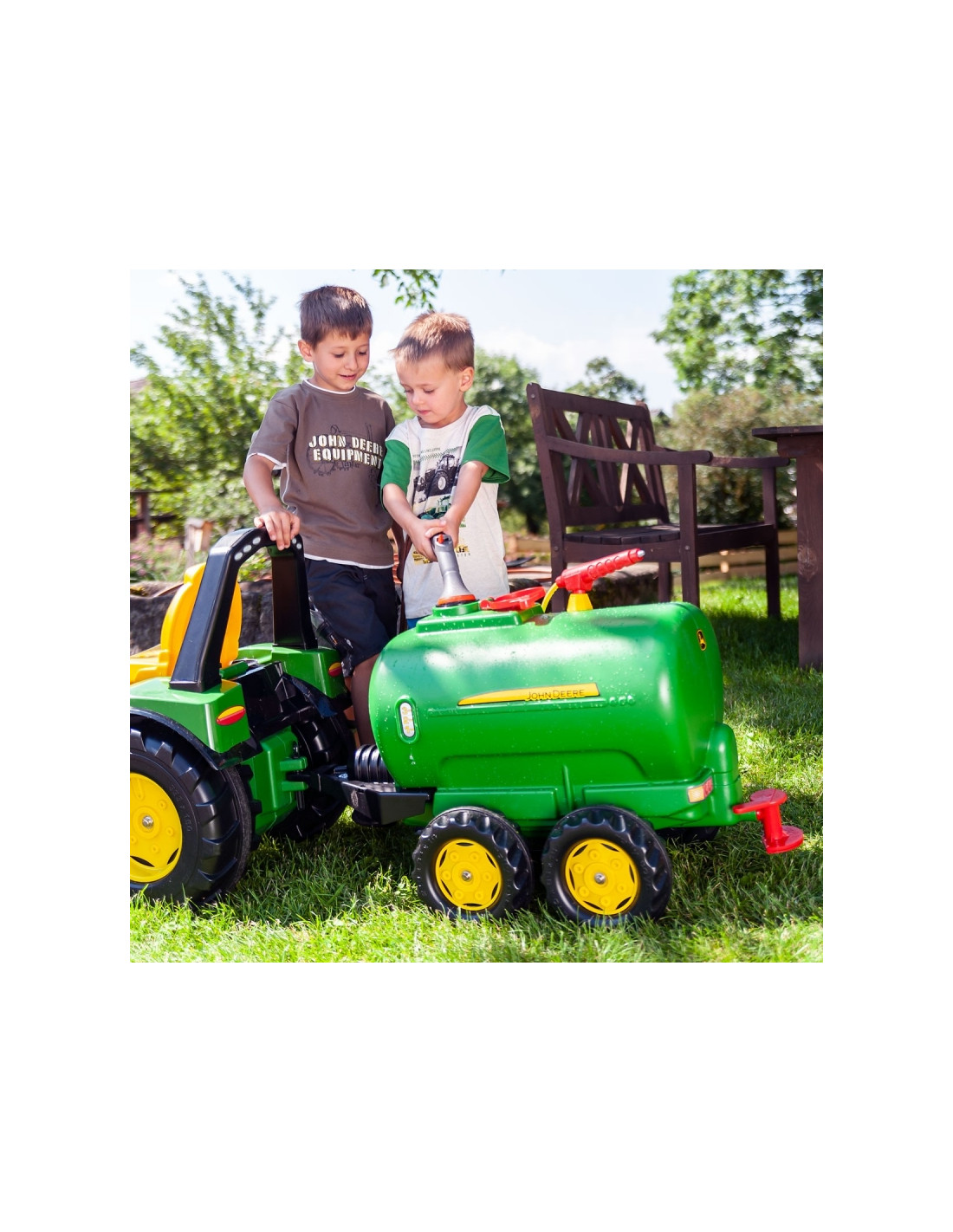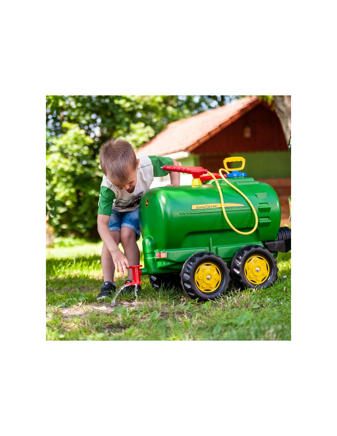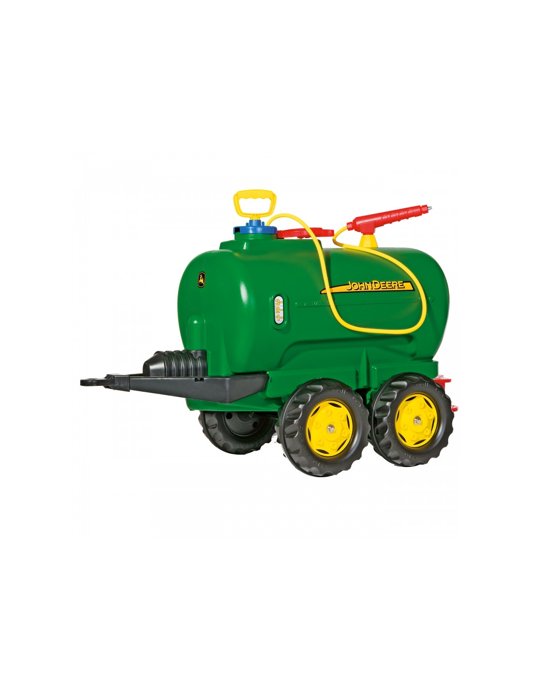 Этот прицеп совместим со всеми тракторами ROLLY TOYS. Это двухосная цистерна, сертифицированная John Deere, которую можно заполнять водой, а затем распылять с помощью распылителя и насоса.